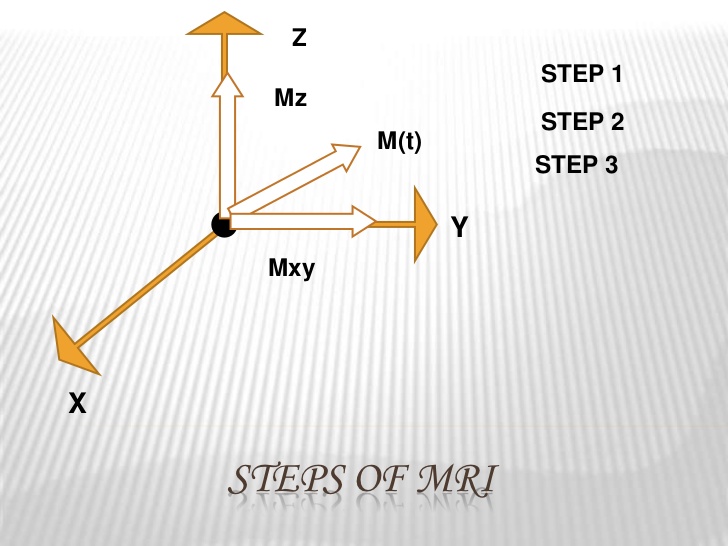 RF pulse를 가하여 proton의 종축 자기화 (Mz)를 횡축으로 눕히게 되면 Mxy라는 vector가 형성된다. Mz가 Mxy로 바꾸어야 MR 신호가 된다. 90도 펄스 직후에는Mxy가 100%, Mz가 0%가 되는 순간이 오는데, 이 순간 T1, T2 relaxation이 시작된다. Mz가 relaxation에서 회복되는 것이 T1이고, Mxy가 100%에서 relaxation 되는 것이 T2 relaxation curve 이다. 동시에 일어나고 서로 독립적으로 일어나고, T2가 T1의 대략 10배 빠르게 회복된다.