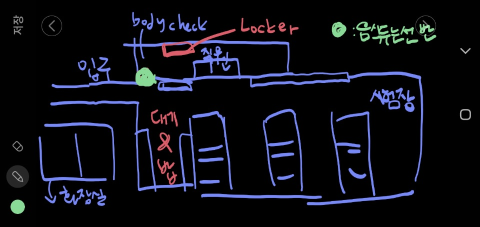 쉬는 시간에는 위 사진에서 대기라고 써진 곳에서 쉬게 되며 다른 수험자를 마주칠 수 있습니다. 밥도 저기서 알아서 먹어야 합니다. 샌드위치 같이 냄새 안나고 빨리 먹을 수 있는 게 눈치안보이고 편한 것 같아요. 본인 스타일 (남 눈치 보는지 안보는지 등)에 맞추어 간식은 잘 챙겨가시기 바랍니다.